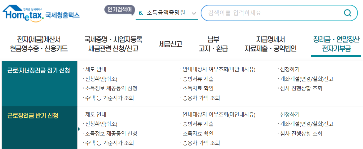 근로장려금 신청은 정기신청과 상반기, 하반기 각각 신청 가능한 반기 신청으로 나누어 집니다.