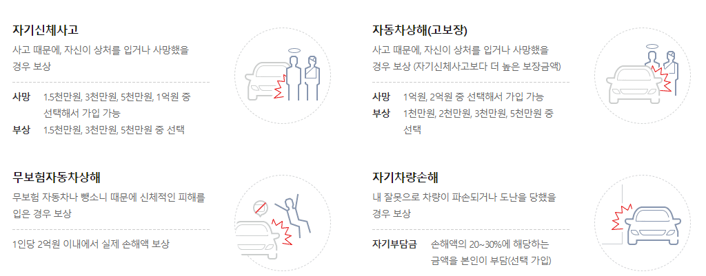 - 무보험자동차상해 : 뺑소니, 무보험차 사고 시 신체적인 피해를 입은 경우 보상
