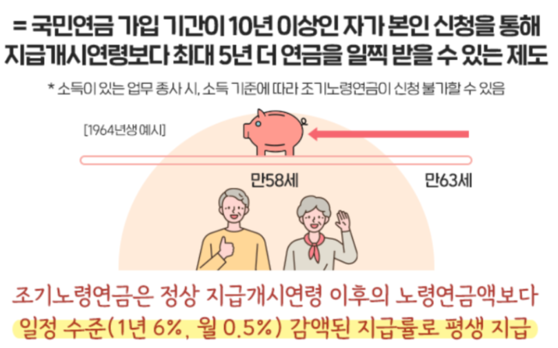 국민연금 가입기간이 10년이상인 분들을 대상으로 지급 개시 연령보다 최대 5년 일찍 연금을 받을 수 있는 제도 입니다. 소득이 있는 경우에는 소득 구간별로 조기 수령이 가능하지 않을 수 도 있습니다.
